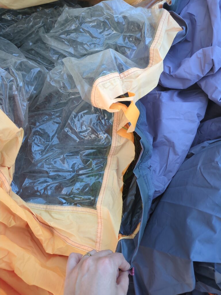 Mein Zelt hatte offensichtlich seine Zeit abgelebt. Der Stoff hatte nur noch die Haltbarkeit einer einlagigen Papierserviette. Die Sonne hat nach vielen Jahren ihr Opfer gefordert. Da helfen auch keine neuen Nähte. Unschöne Überraschung.