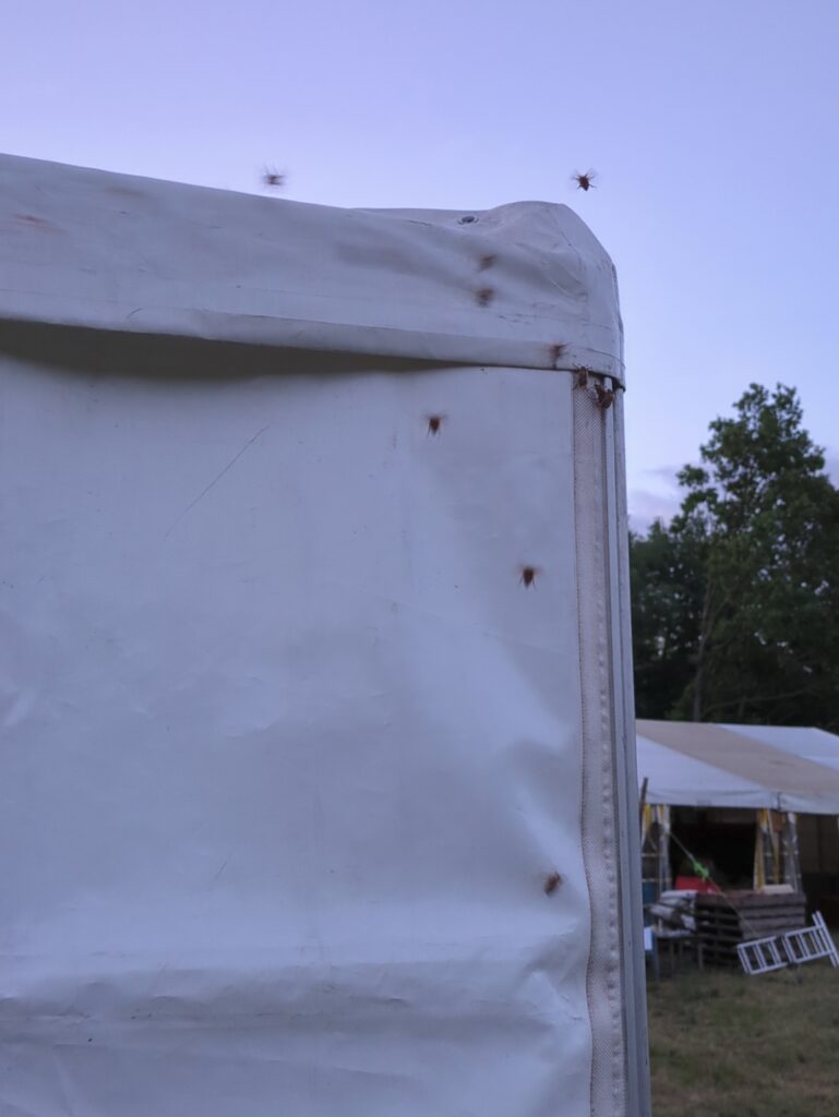 Zum Leidwesen vieler, die keine Insekten mögen, hatten wir wieder ein Junikäfer Jahr. Alle paar Jahre ist der Zyklus um, und die Käfer schwärmen zu Tausenden aus. Manche Leute sind abends gar nicht mehr aus dem Zelt raus gegangen, bis es richtig dunkel war. Die Käfer werden in der Dämmerung wach und umschwärmen alles was hell ist. Helle Zeltecken, leuchtende Shirts, Lampen…alles Käfermagnete. Man hat die in den Haaren gehabt, die sind in Taschen und Feuerstellen gefallen…es hat geknackt beim Laufen auf der Wiese. Tagsüber sind die vor Überhitzung auch aus den Bäumen gepurzelt. Käfer waren immer und überall. Das einzig bedrohliche an den kleinen Geschossen ist allerdings nur das Gebrumm beim Fliegen und das unkontrollierte Flugmanöver.