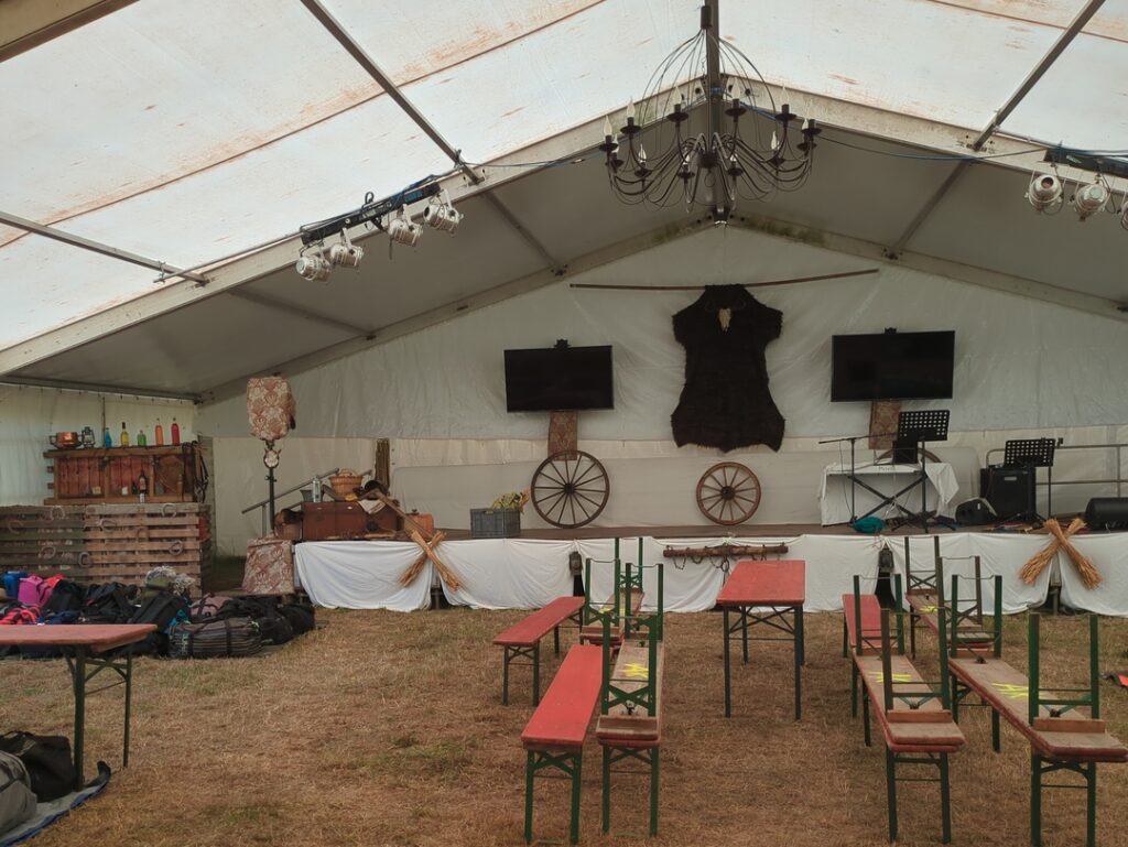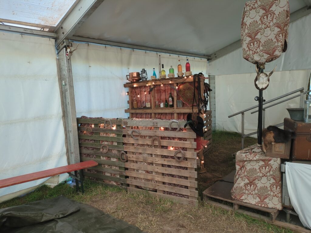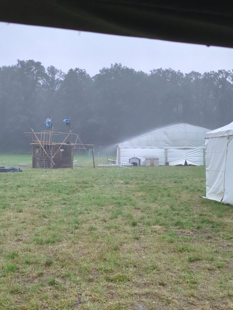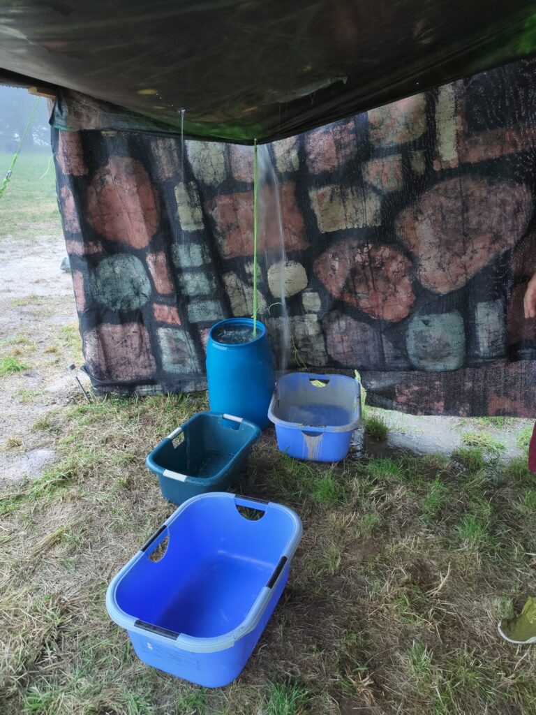Wem das mit den Fässern und Wannen albern erscheint: Die Massen an Wasser die von der Dachplane kommen und direkt vor den Eingang fallen, fluten uns das Zelt und spülen uns den ganzen Boden, vor allem untern den Regalen, weg . Da doch lieber die Fässer mitten auf der Wiese ausschütten und den trockenen Boden im Zelt behalten -Im 10sek-Takt wird abtransportiert . Solche Sturzfluten sind zum Glück nicht so häufig.